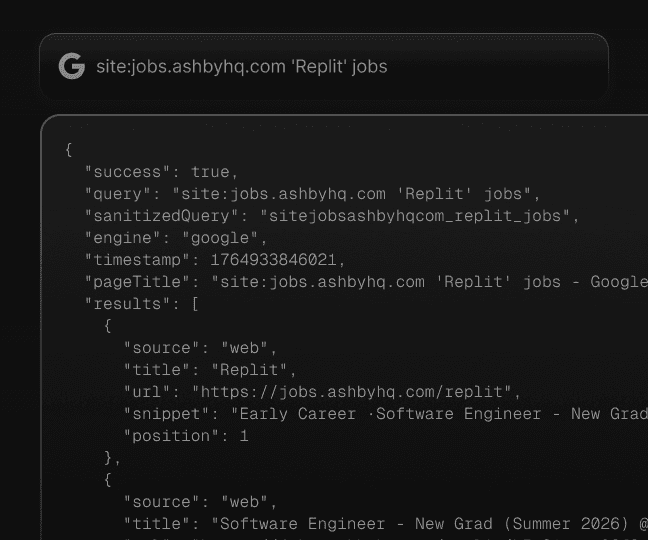 Our Web Search API gives you a clean JSON response of Google’s live SERP with ranking data, snippets, and metadata so you don’t have to maintain the infrastructure.