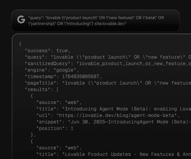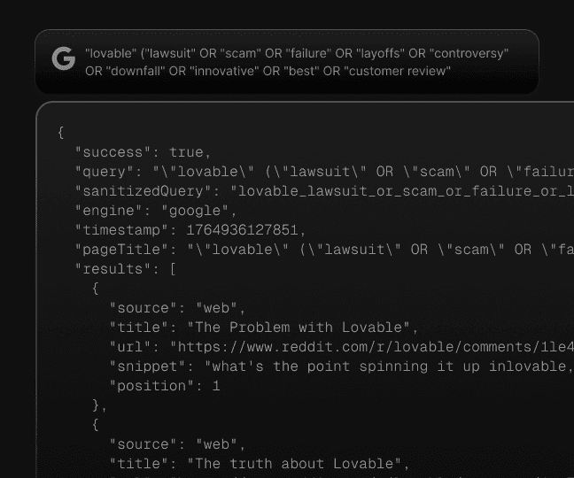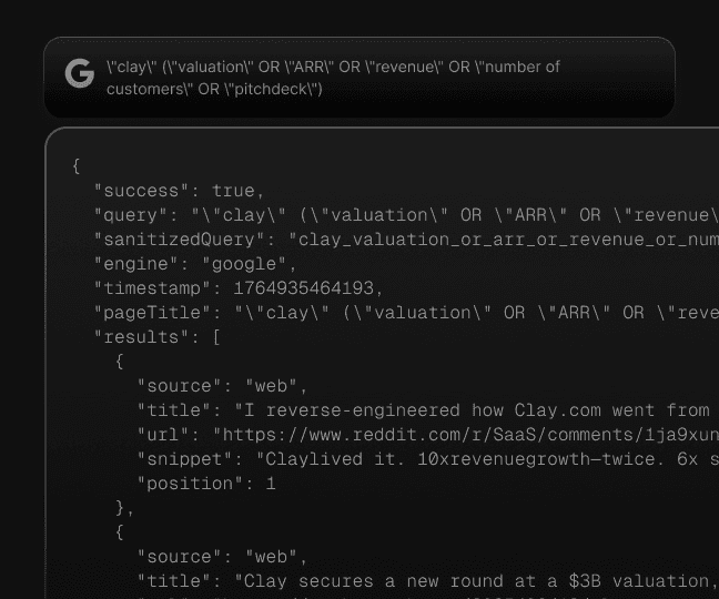 With a single request, your agent can query any keyword or phrase and get clean JSON in seconds.