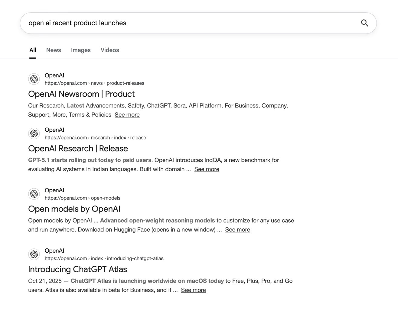 { "success": true, "query": "open ai recent product launches", "sanitizedQuery": "open_ai_recent_product_launches", "engine": "google", "timestamp": 1764092871593, "pageTitle": "open ai recent product launches - Google Search", "results": [ { "source": "web", "title": "OpenAI Newsroom | Product", "url": "https://openai.com/news/product-releases/", "snippet": "Our Research,LatestAdvancements, Safety, ChatGPT, Sora, API Platform, For Business, Company, Support, More, Terms & Policies", "position": 1 }, { "source": "web", "title": "OpenAI Research | Release", "url": "https://openai.com/research/index/release/", "snippet": "GPT-5.1 starts rolling out today to paid users. OpenAI introduces IndQA, a new benchmark for evaluating AI systems in Indian languages. Built with domain ...", "position": 2 }, { "source": "web", "title": "Open models by OpenAI", "url": "https://openai.com/open-models/", "snippet": "Open models by OpenAI ...Advanced open-weight reasoning modelsto customize for any use case and run anywhere. Download on Hugging Face (opens in a new window) ...", "position": 3 }, { "source": "web", "title": "Introducing ChatGPT Atlas", "url": "https://openai.com/index/introducing-chatgpt-atlas", "snippet": "ChatGPT Atlas is launching worldwide on macOS todaay to Free, Plus, Pro and Go users. Atlas is also available in beta for Business, and if ...", "position": 4 }, { "source": "web", "title": "OpenAI rolls out ChatGPT shopping tool before Black Friday", "url": "https://www.axios.com/2025/11/24/chatgpt-shopping-research-openai-black-friday", "snippet": "21 hours ago—OpenAIis giving ChatGPT a holiday upgrade with anewshopping research feature that scoursproductpages, reviews and prices ahead of Black ...", "position": 5 }, { "source": "web", "title": "OpenAI Launches Shopping Research Feature Aimed at ...", "url": "https://wwd.com/business-news/technology/openai-chatgpt-shopping-research-ecommerce-holiday-gifting-2-1238360798/", "snippet": "22 hours ago—The technology company said Monday that it haslaunchedan additional tool, which it calls shopping research, to help consumers withproduct...", "position": 6 }, { "source": "web", "title": "Introducing apps in ChatGPT and the new Apps SDK", "url": "https://openai.com/index/introducing-apps-in-chatgpt/", "snippet": "Oct 6, 2025—Later this year, we'lllaunchapps to ChatGPT Business, Enterprise and Edu. We'll alsoopensubmissions so developers can publish their apps in ...", "position": 7 }, { "source": "web", "title": "OpenAI (@OpenAI) / Posts / X", "url": "https://x.com/OpenAI", "snippet": "Introducing shopping research, anewexperience in ChatGPT that does the research to help you find the rightproducts. ... Nov 19.NewChatGPT Atlasreleaseout!", "position": 8 }, { "source": "web", "title": "OpenAI launches shopping research feature to power ...", "url": "https://www.business-standard.com/technology/tech-news/openai-shopping-research-feature-chatgpt-125112500923_1.html", "snippet": "5 hours ago—OpenAIhas introduced anewshopping research feature in ChatGPT that helps users findproducts, build personalised guides and use past ...", "position": 9 } ], "metadata": { "totalResults": 9 } }