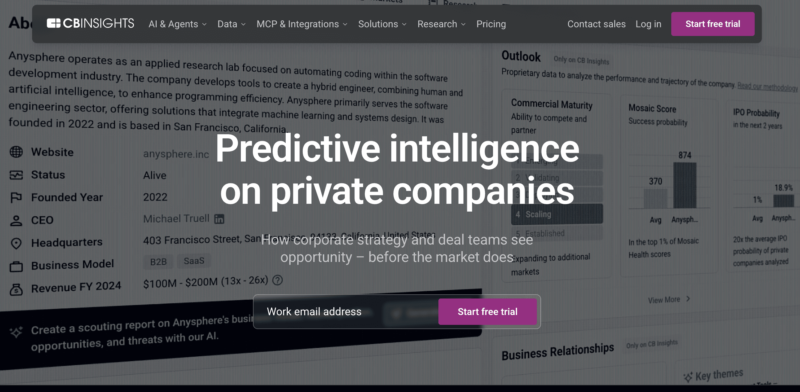 CB Insights combines startup intelligence with market analytics, offering predictive scoring, trend analysis, and competitive landscape mapping.