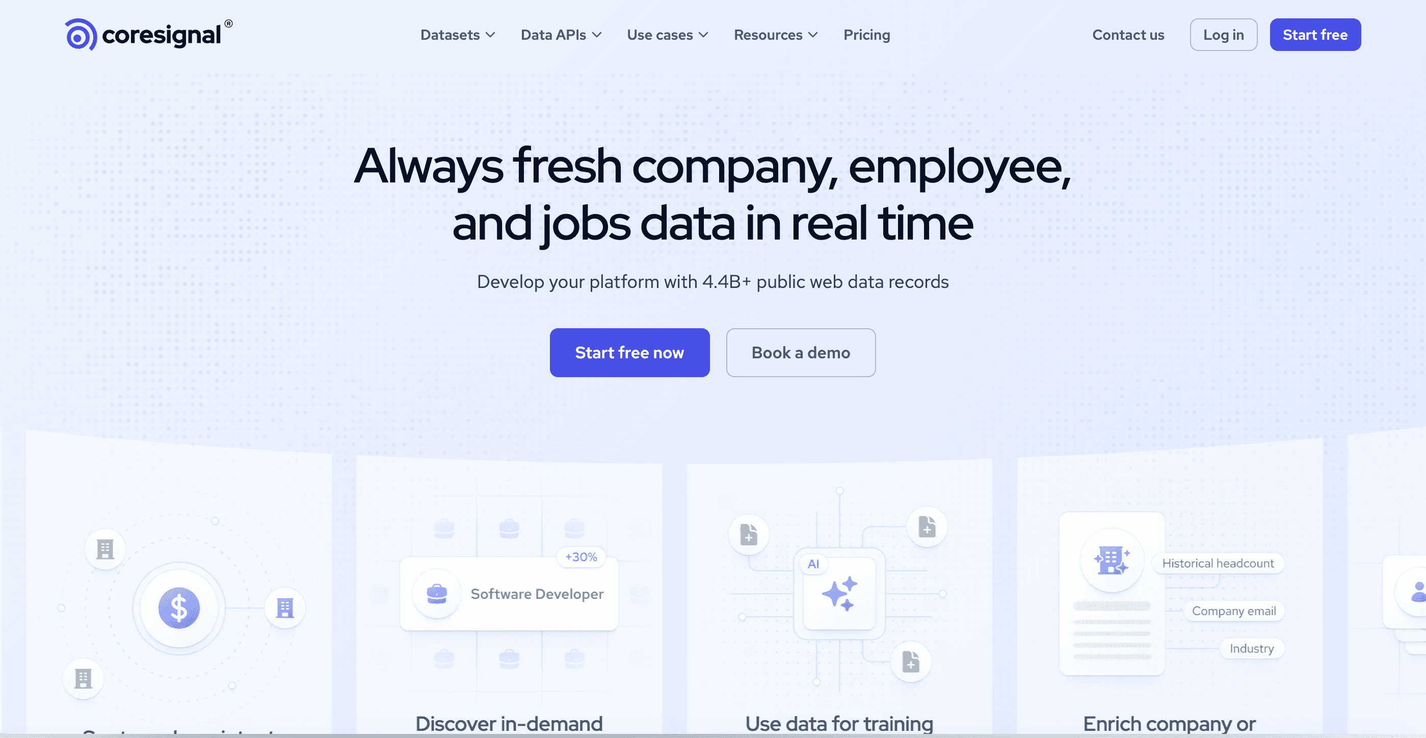 For deal sourcing specifically: Hiring velocity and job posting data are leading indicators of company growth that many deal sourcing teams track. Coresignal's employee and job data let you build custom growth scoring models. Less useful for funding data and investor networks than PitchBook.
