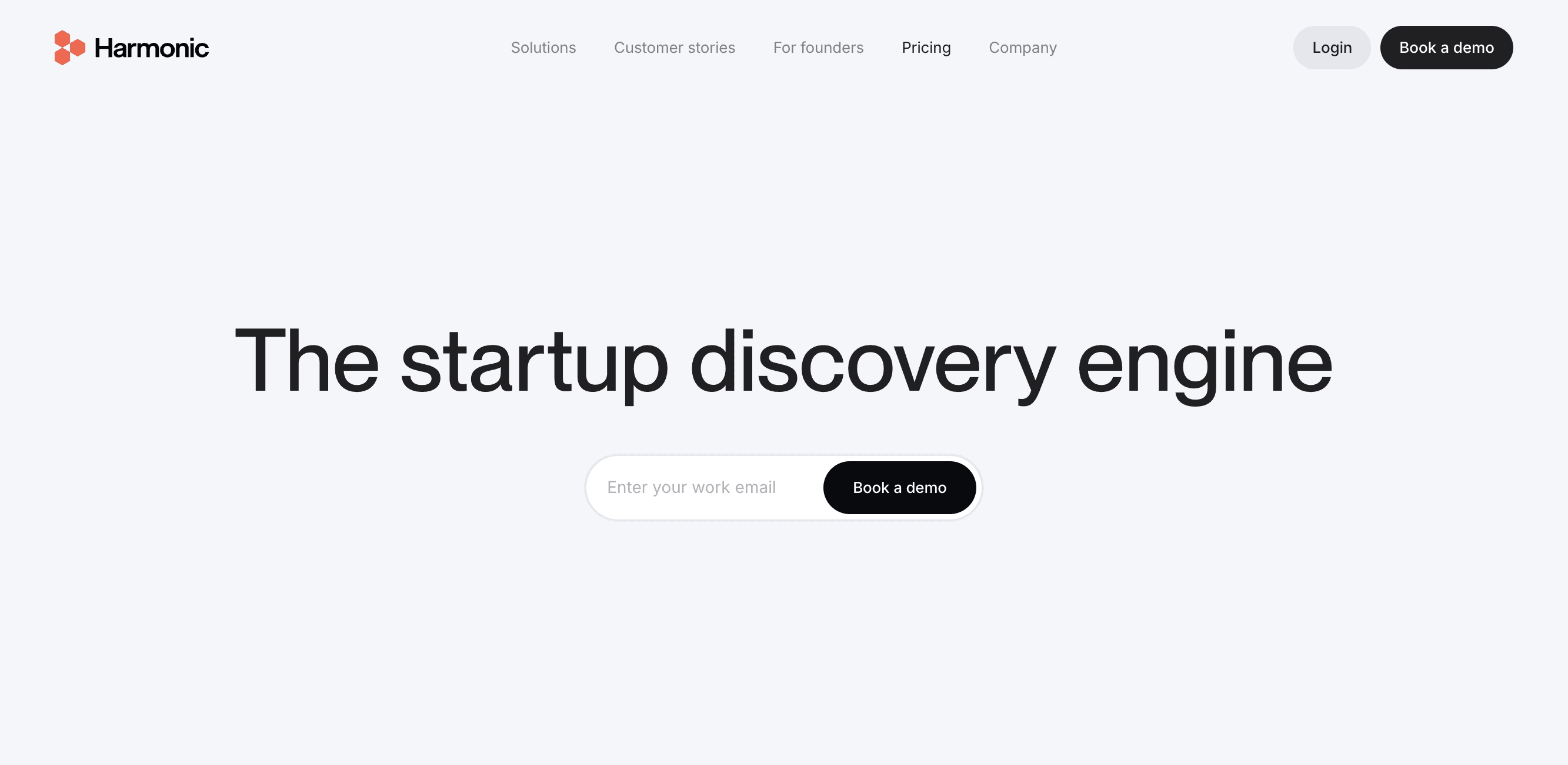 Harmonic.ai focuses on early-stage startup discovery, tracking companies from founding through Series A with a focus on founder signals and early traction indicators.