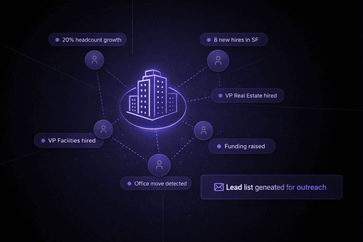 The signals that predict when a company will need more office space, things like hiring velocity, funding rounds, and headcount expansion, lived in a completely different data universe that no traditional CRE data provider covered