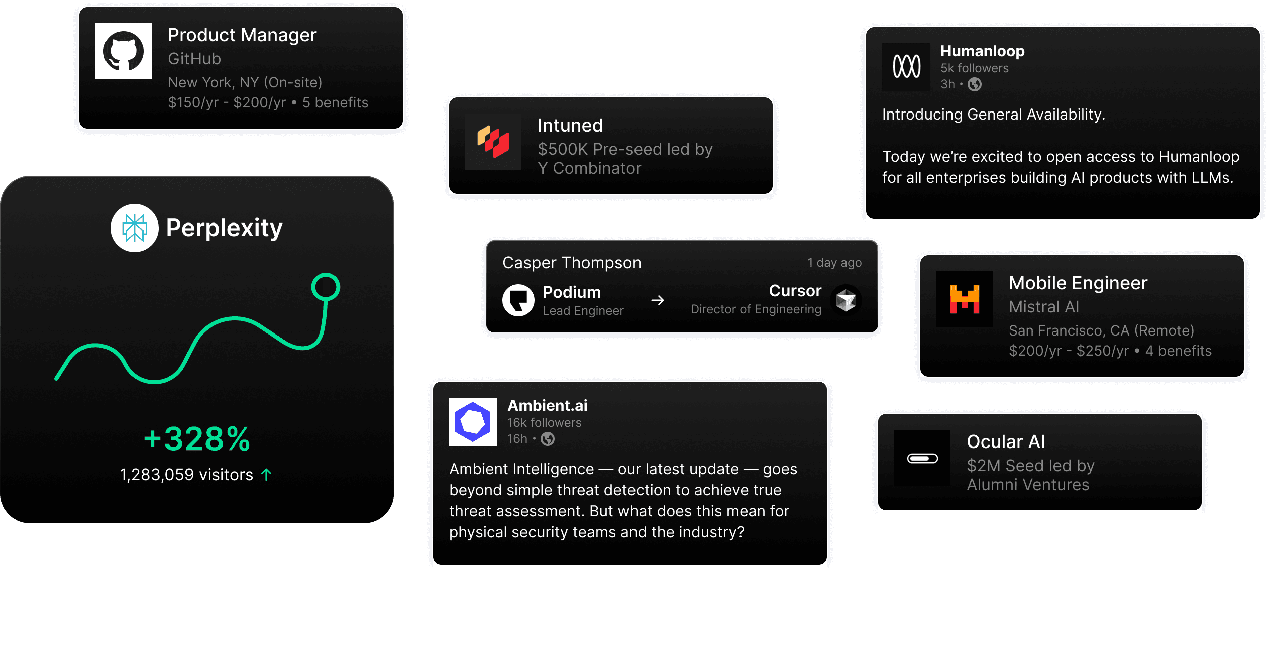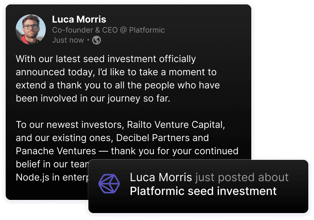 Once you've identified the companies you’re interested in, enrich your insights with live founder data. Track what founders are saying and get instant alerts when something changes - whether it’s a major move, new announcement, or key decision.
