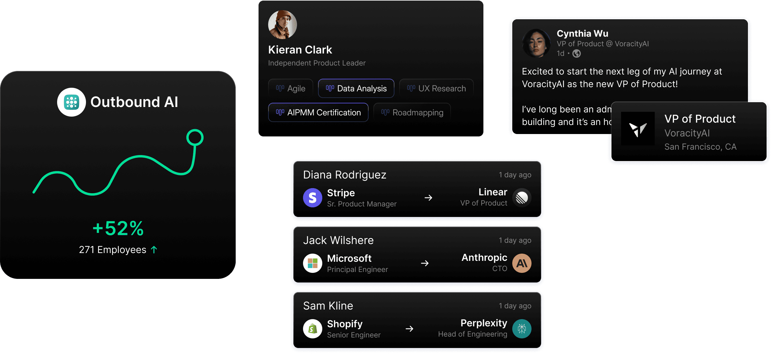 Update company and people data instantly with changes like headcount growth, key decision maker hires, job moves, new skills and more.
